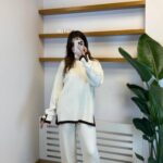 Kontrast Manşet Gold Düğmeli Triko Takım – Ekru