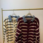 Bordo rengin sıcak tonuyla birleşen ekru çizgiler, bu hırkaya çok zarif bir görünüm katıyor. Denim yakasında kullanılan inci ve taş işlemeleri, ürünün tamamen özel tasarım hissi vermesini sağlıyor.