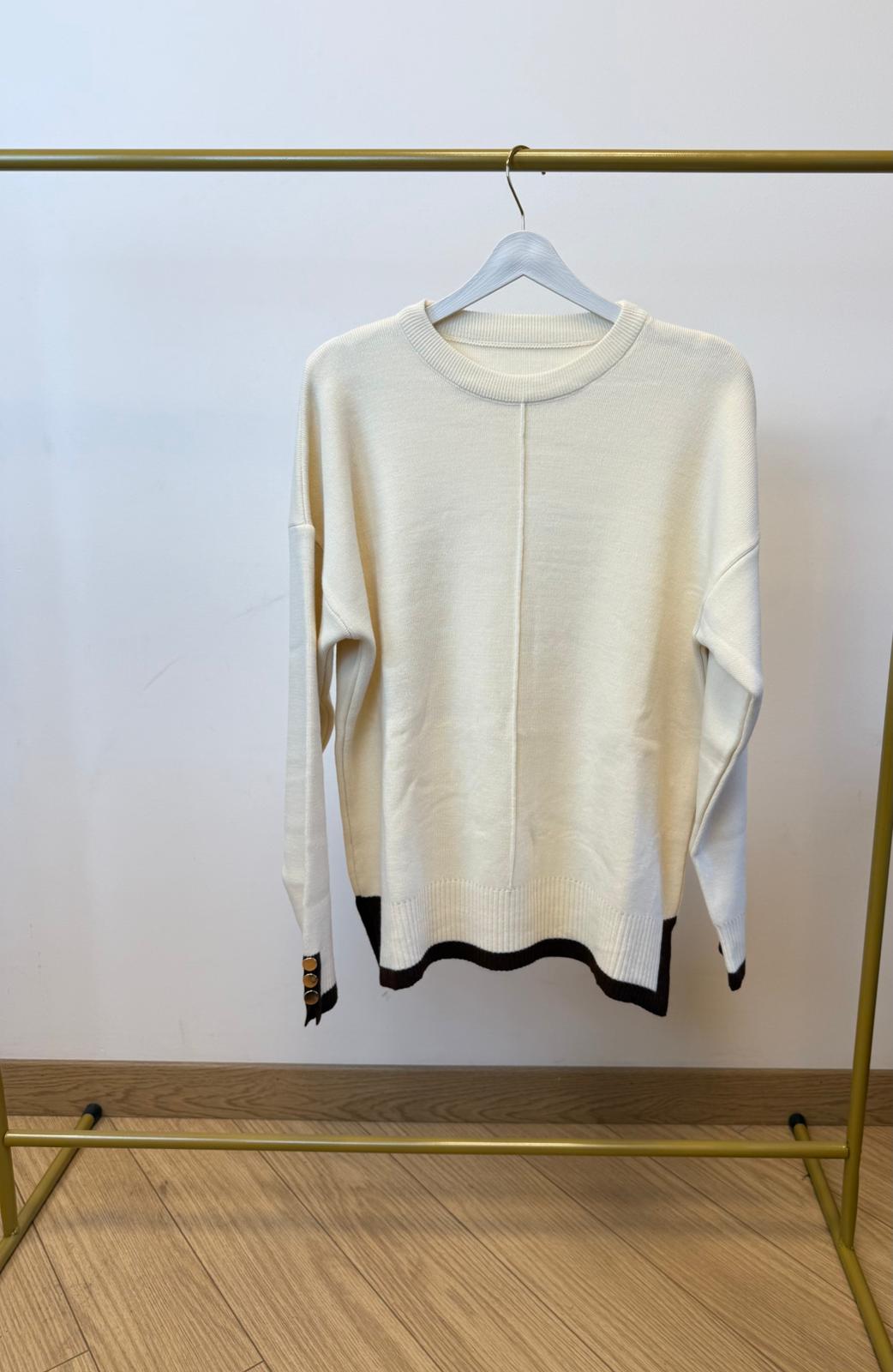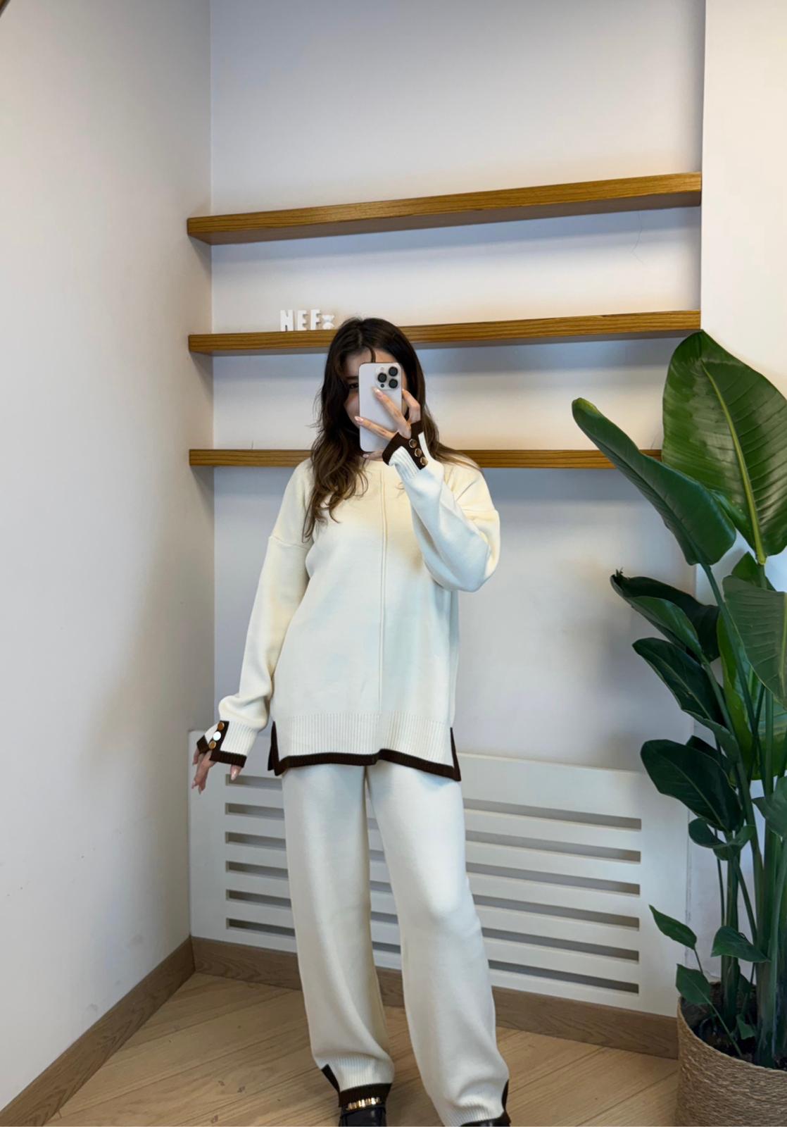 30.11.2025Kontrast Manşet Gold Düğmeli Triko Takım – Ekru