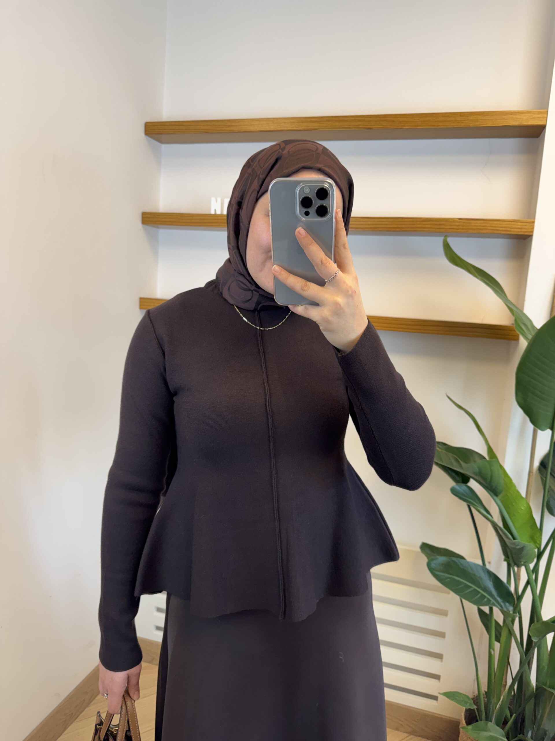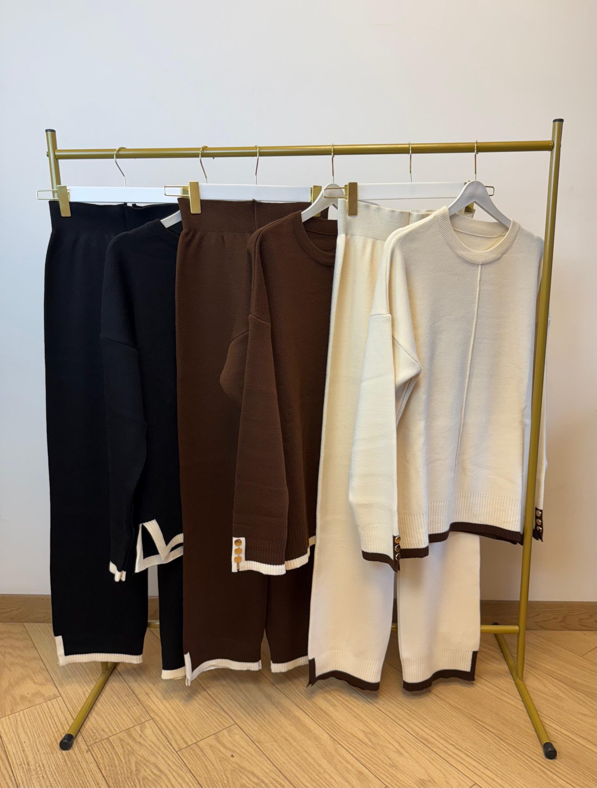 Kontrast Manşet Gold Düğmeli Triko Takım – Kahve