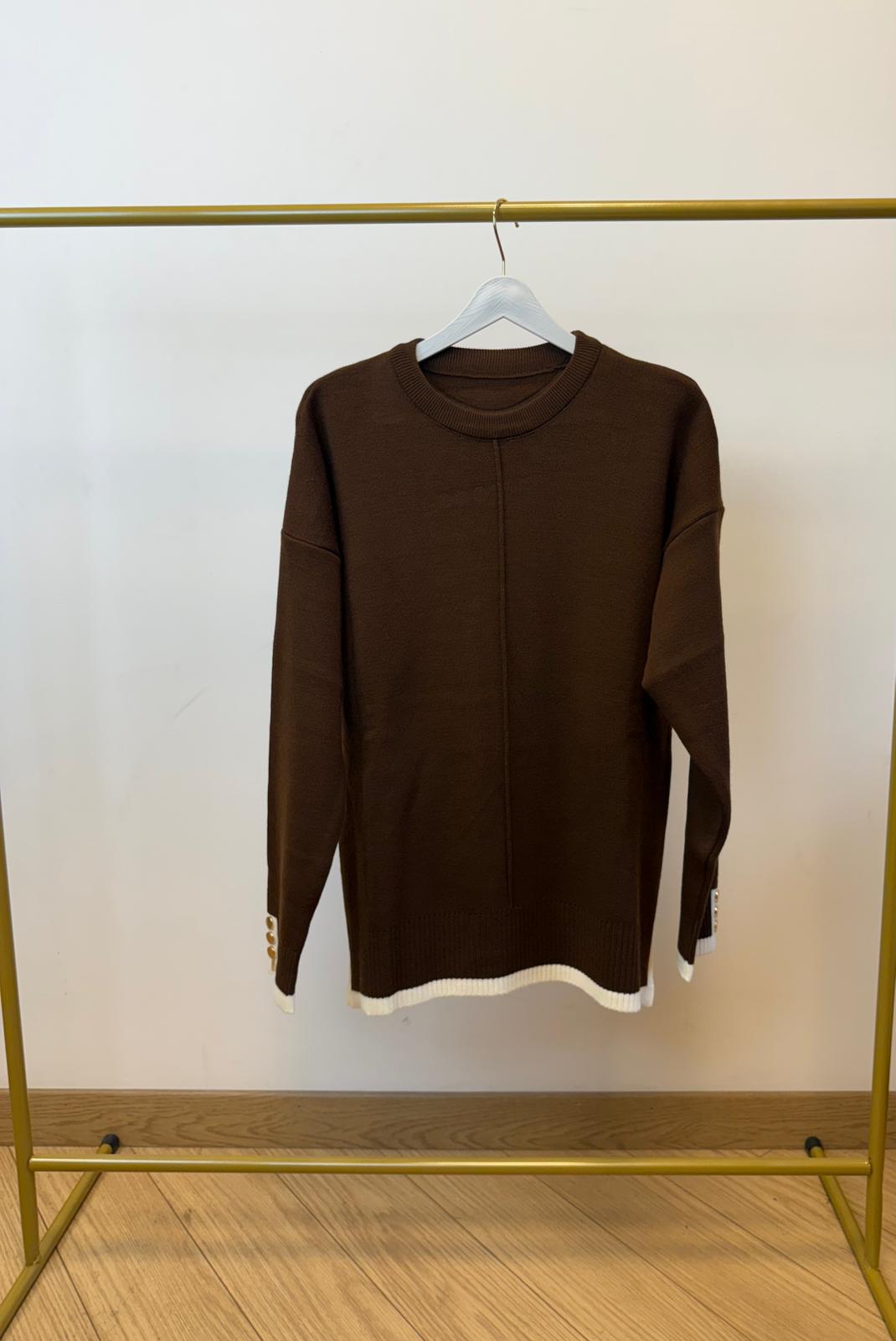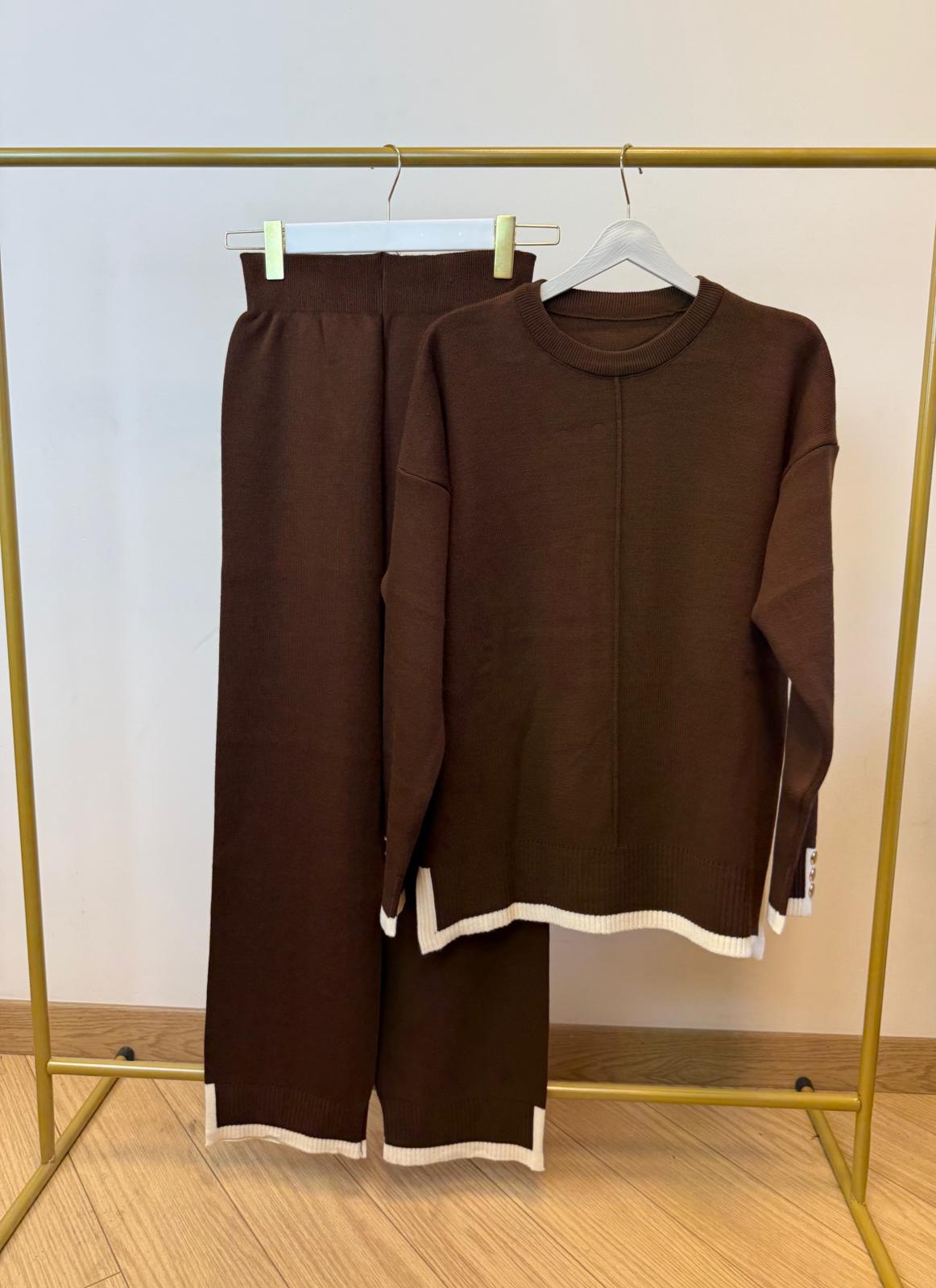 30.11.2025Kontrast Manşet Gold Düğmeli Triko Takım – Kahve