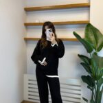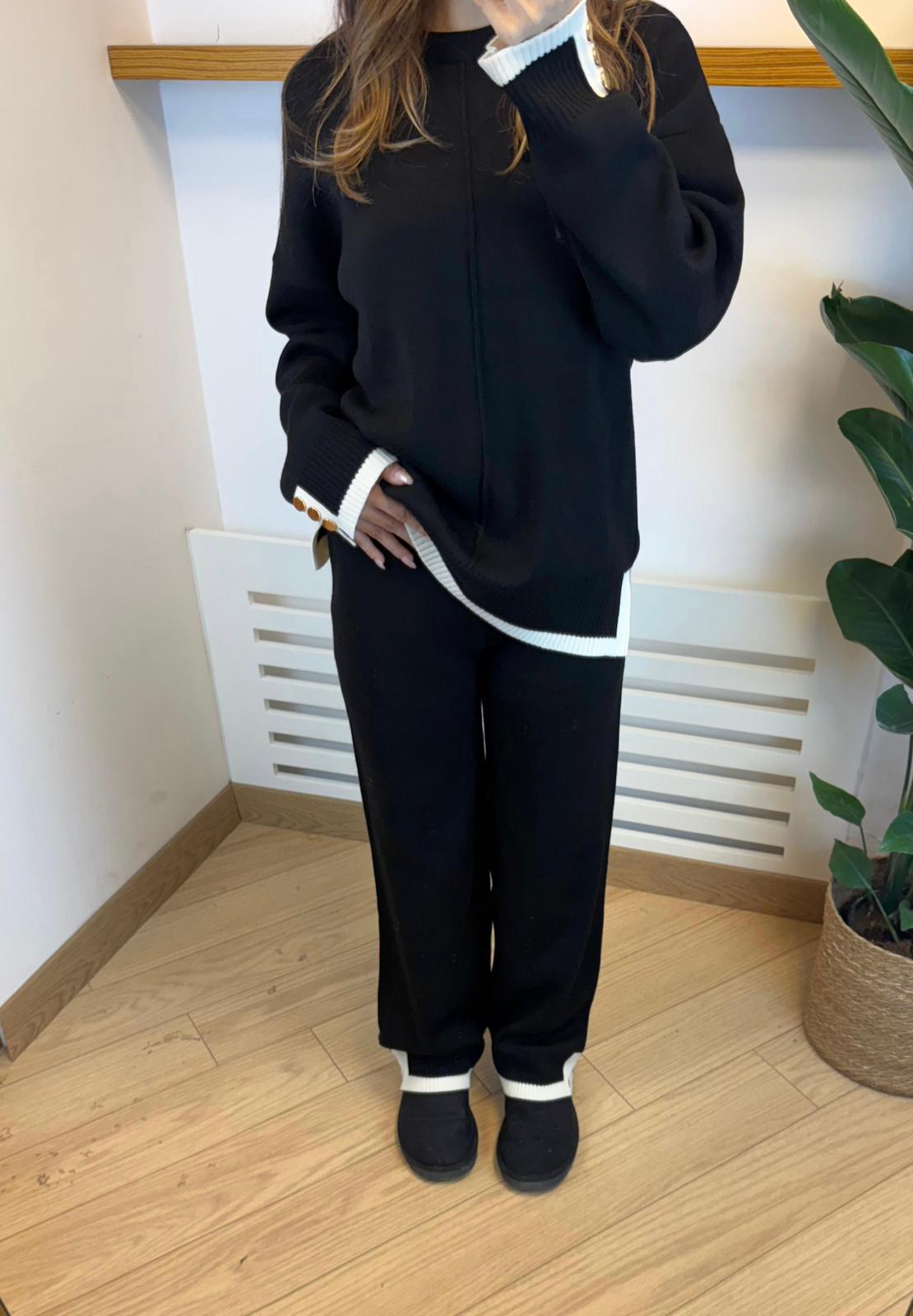 Kontrast Manşet Gold Düğmeli Triko Takım – Siyah