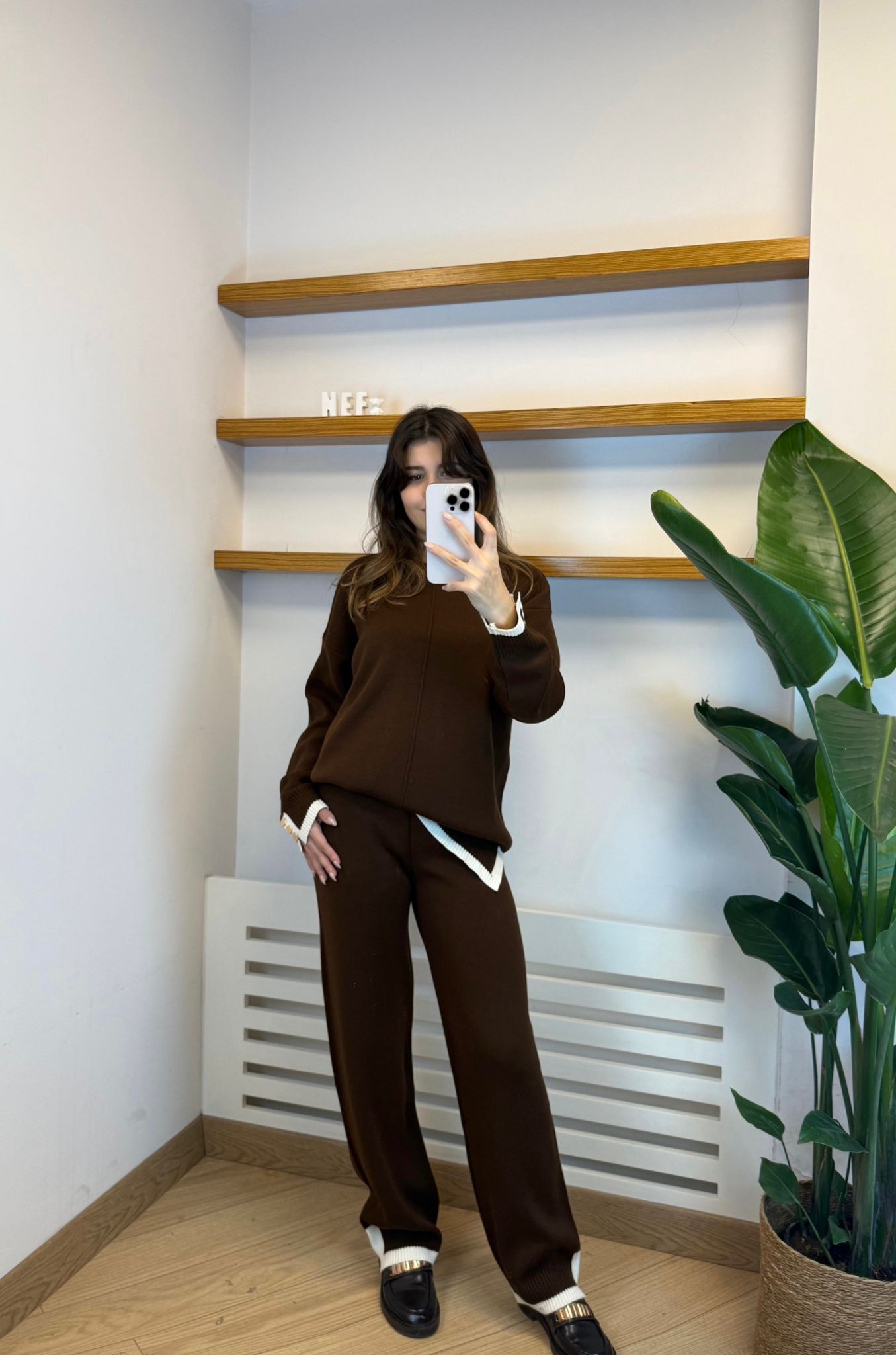 Kahverenginin sıcak ve sofistike duruşunu ekru kontrast detaylar ve gold metal düğmeli manşetlerle buluşturan bu triko takım, modern ve şık bir görünüm sunar. Yumuşak dokulu triko kumaşı sayesinde gün boyu konfor sağlarken, oversize üst formu ve rahat kesim pantolonu ile hem günlük kullanıma hem de şık kombinlere kolayca uyum sağlar. Sonbahar/Kış sezonu için ideal olan bu set, üst ve pantolondan oluşan iki parçalı yapısıyla pratik ve stil sahibi bir duruş kazandırır. Kahve–Ekru renk kombinasyonuyla sunulan bu model, zamansız tonlarıyla gardırobunuzun kurtarıcı parçalarından biri olmaya adaydır. Materyal Bileşeni: %100 Akrilik. Yıkama Talimatı: Triko dokunun formunu korumak için çamaşır makinesinde hassas programda, soğuk suyla ve benzer renklerle yıkamanız; ağartıcı kullanmamanız, sıkma işlemini düşük devirde yapmanız ve düz zeminde kurutmanız önerilir. Model Ölçüleri: Boy 1.62 cm, Kilo 55 kg; model üzerindeki ürün standart bedendir ve rahat/oversize duruş sergilemektedir.