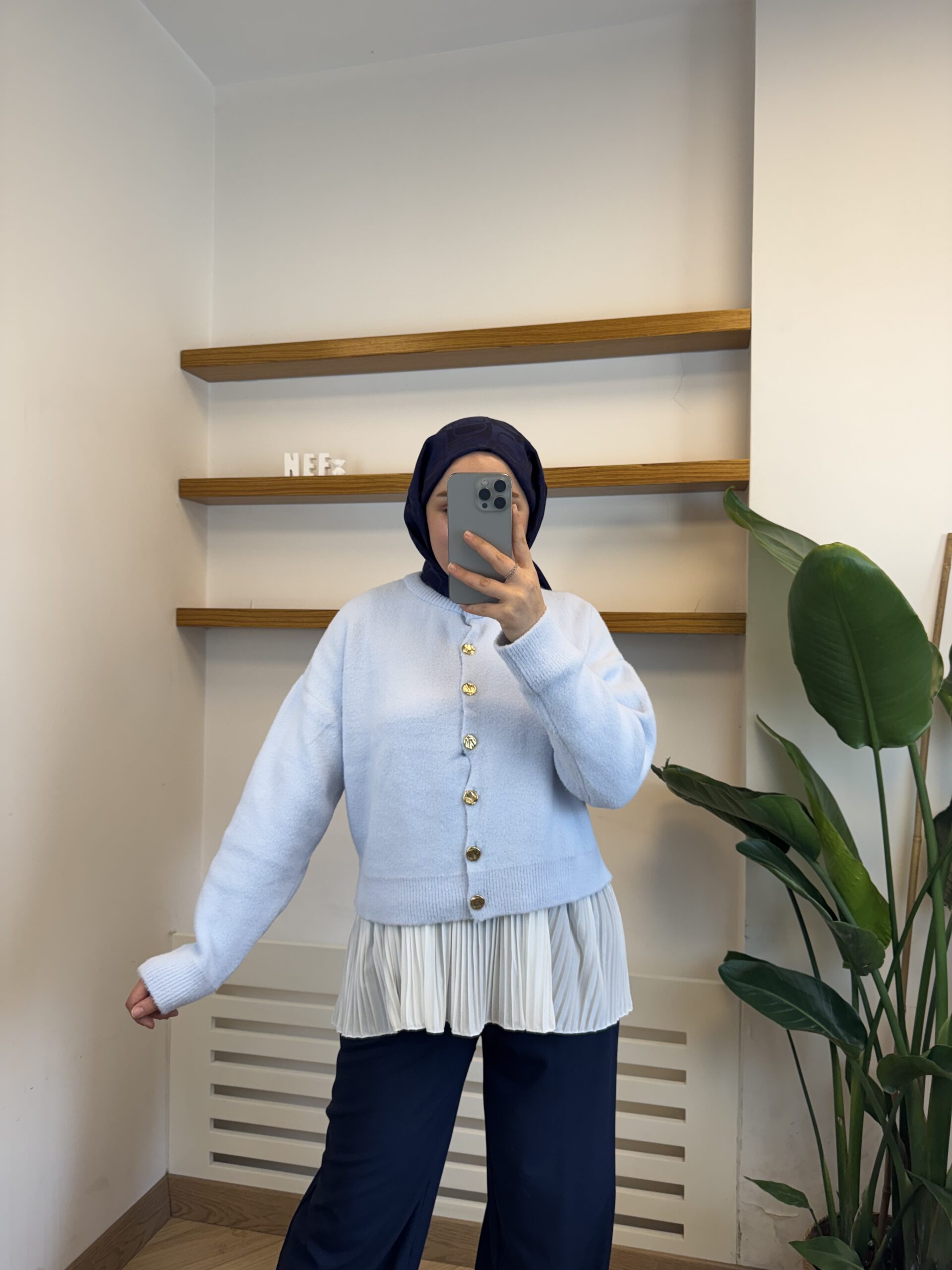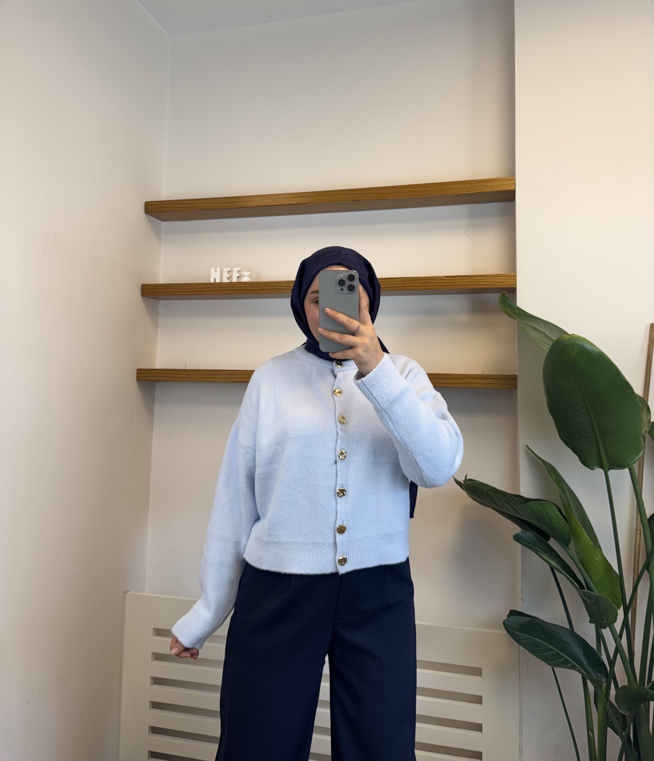 19.12.2025Peluş Gold Düğmeli Kısa Hırka – Mavi