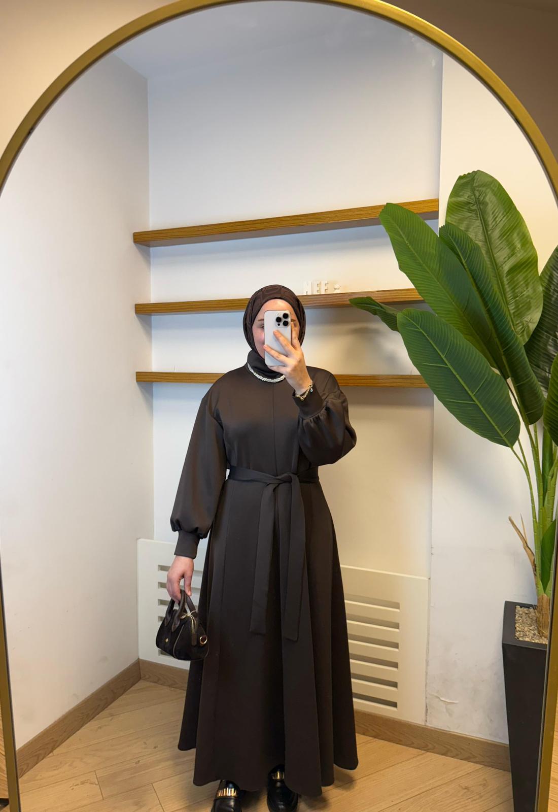 30.11.2025Premium Sucuba Kumaş Kuşaklı Elbise – Kahve