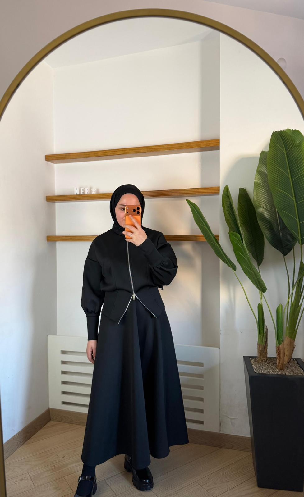 Kloş eteği arkadan lastikli ve yandan fermuarlı yapısıyla hem rahatlık hem de şık bir duruş sağlar. Siyah rengin asil görünümüyle özel günlerden günlük kombinlere kadar geniş bir kullanım alanı sunar.