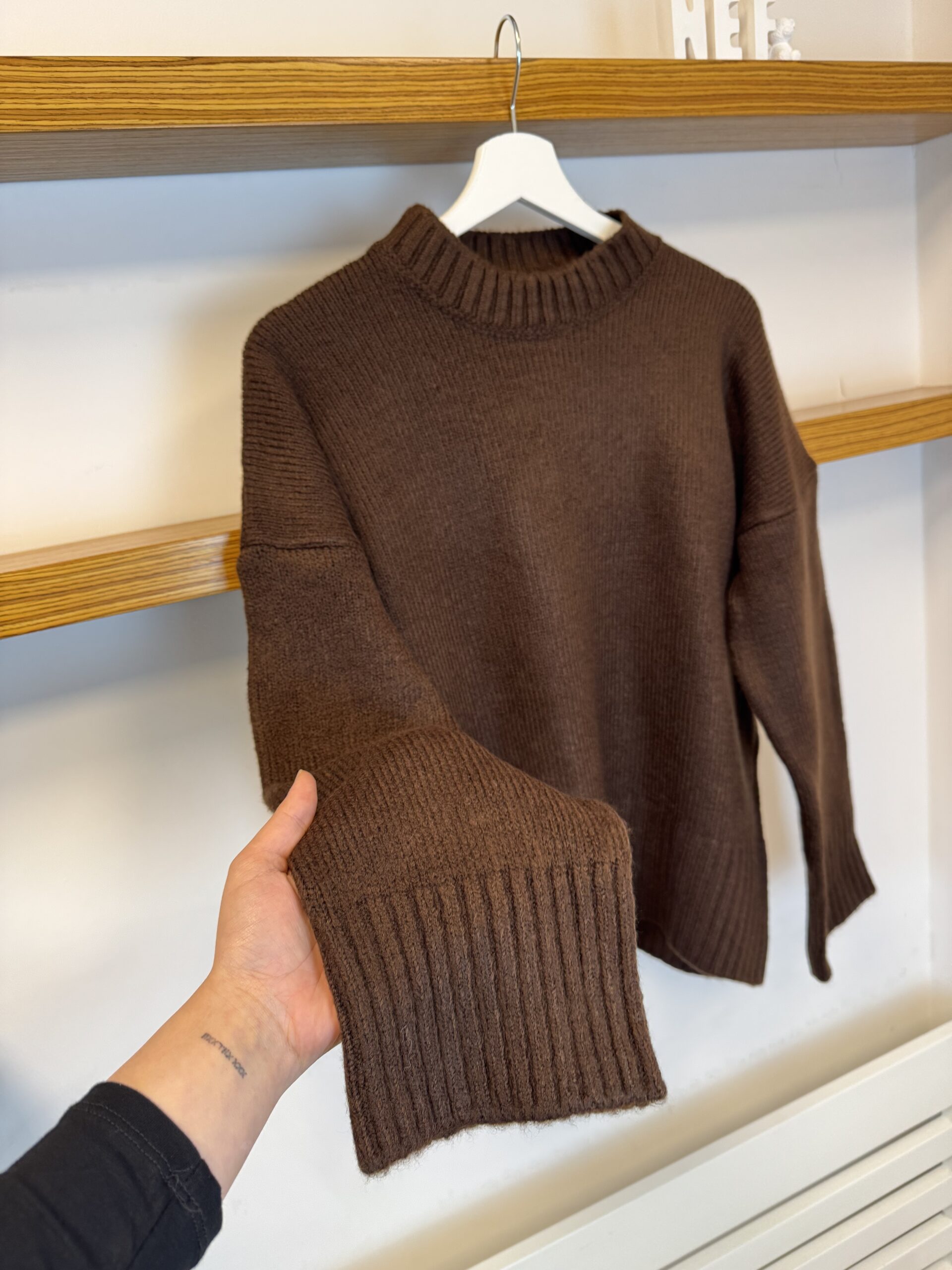 Zamansız kahverengi tonu ve yumuşak triko dokusuyla öne çıkan bu kazak, rahat kesimi sayesinde gün boyu konforlu bir kullanım sunar. Uzun kollu ve yüksek yakaya yakın tasarımıyla serin havalarda sıcak tutarken, sade formu sayesinde hem günlük hem de şık kombinlere kolayca uyum sağlar. Materyal bileşeni %100 akrilik olan ürün, 30°C’de hassas yıkama, ağartıcı ve tamburlu kurutma yapılmaması önerilerek uzun ömürlü kullanım sunar. Manken ölçüleri boy 160 cm, kilo 57 kg olup, ürün manken üzerinde rahat kalıp durmaktadır.